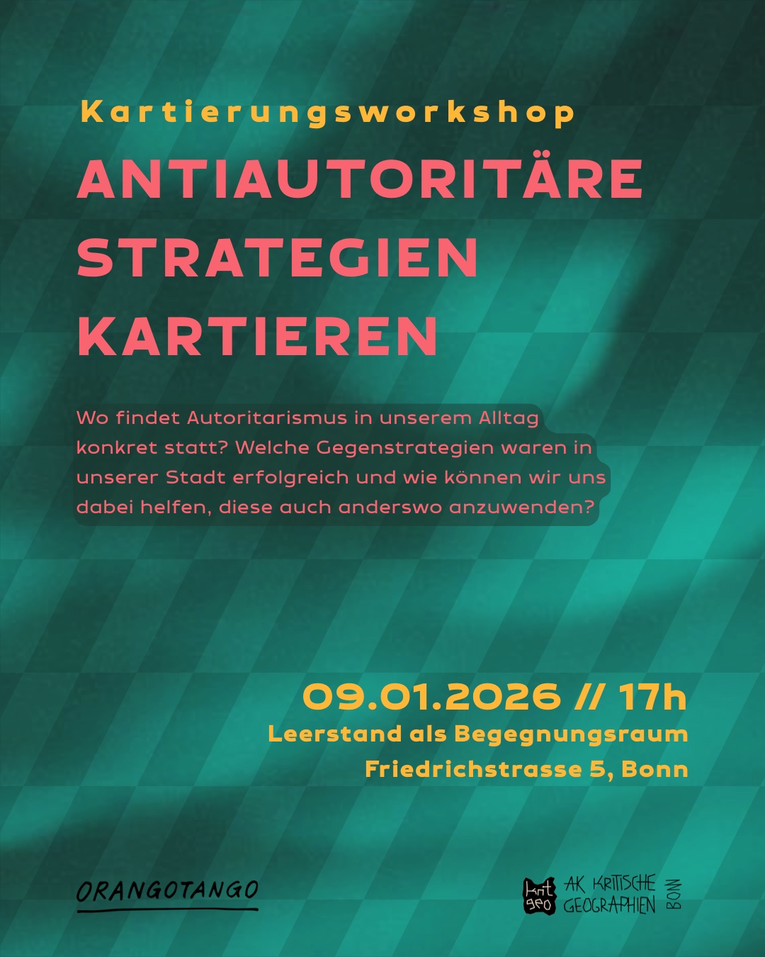 Wo und wie findet ‚der Rechtsruck‘ in unserem Alltag konkret statt? Welche autoritären Institutionen und Praktiken sind in unserer Stadt präsent? In diesem Kartierungsworkshop visualisieren wir autoritäre Bestrebungen und machen deren räumliche Muster sichtbar. Anschließend wollen wir Erfahrungen aus antiautoritären Kämpfen teilen und uns vernetzen. Welche Gegenstrategien waren in unserer Stadt erfolgreich und wie können wir uns gegenseitig helfen, diese auch anderswo anzuwenden?