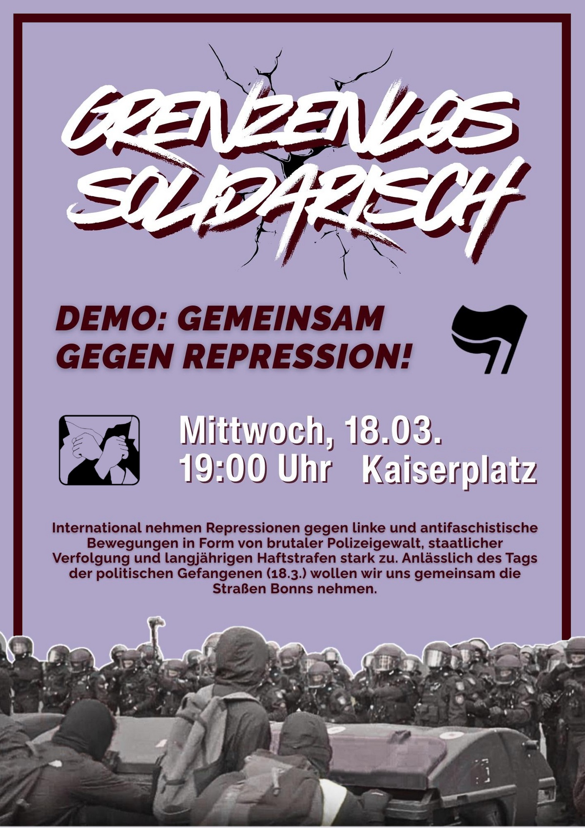 Lasst uns also am 18. März gemeinsam die Straßen Bonns nehmen und zeigen, dass uns weder Repression noch Grenzen aufhalten können. Unsere Solidarität ist stärker.