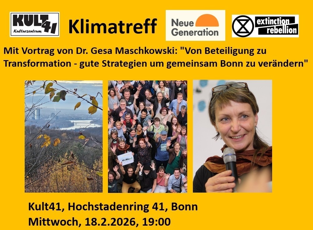 Liebe Menschen, diesen Mittwoch (18.2.) um 19:00 ist wieder Klimatreff von Neue Generation und Extinction Rebellion u.a. im Kult41, dieses Mal mit einem Vortrag von Gesa Maschkowski von Bonn im Wandel zum Thema: "Von Beteiligung zu Transformation - gute Strategien um gemeinsam Bonn zu verändern", was gerade im Hinblick auf Bürger*innen-/Gesellschaftsräte/Losdemokratie spannend werden dürfte.