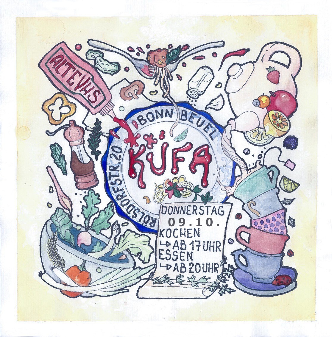 Was ist die KüfA? Bei der KüfA kochen alle, die Lust haben, mit zu schnibbeln und mit zu braten, ab 17 Uhr etwas für sich und alle anderen, die Lust haben, ab 20 Uhr vorbeizukommen und mitzuessen.
