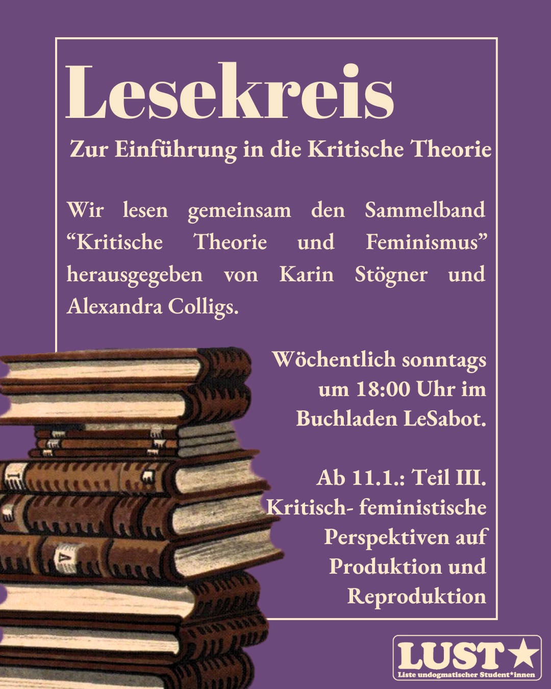 Wir treffen uns wöchentlich sonntags um 18 Uhr im Buchladen LeSabot, um den im Vorhinein gelesenen Text zu diskutieren. Im Vordergrund stehen soll dabei - im Gegensatz zur universitären Praxis - nicht nur das theoretische Verständnis, sondern vor allem auch der persönliche Bezug zu den Texten und deren Anwendung. Es wird kein Vorwissen vorausgesetzt. Ziel ist, dass Neueinsteiger*innen und erfahrenere Leser*innen voneinander lernen können.