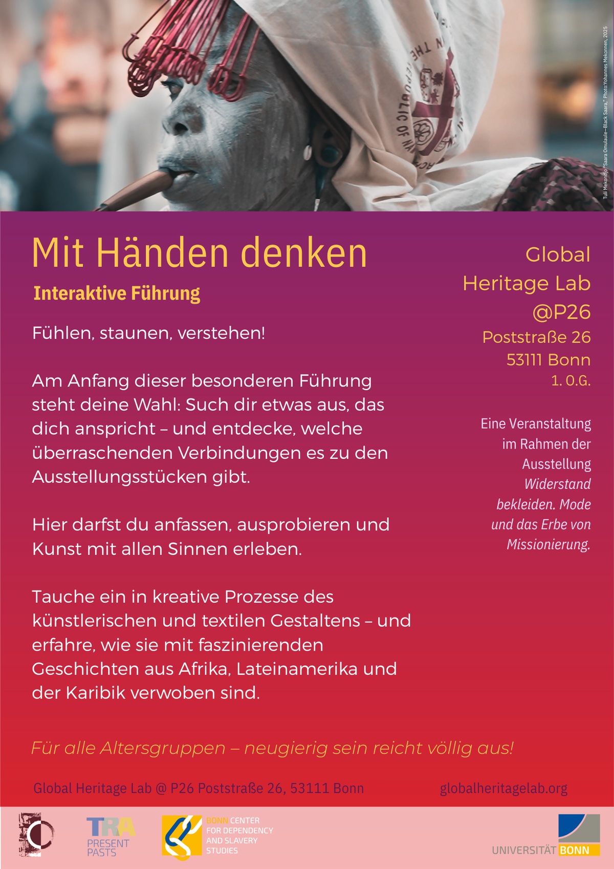 Die Veranstaltung ist Teil des Rahmenprogramms zur Ausstellung „Widerstand bekleiden. Mode und das Erbe von Missionierung“ im Global Heritage Lab/P26