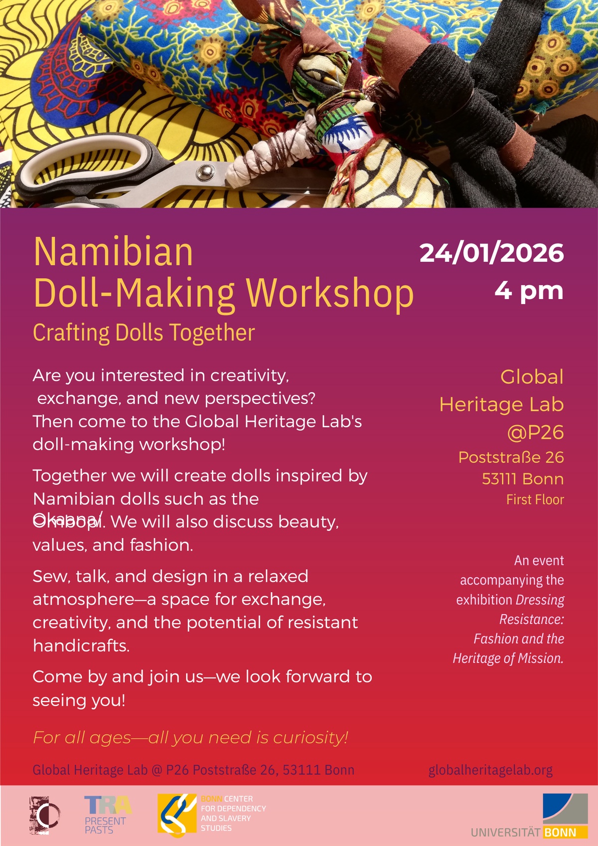 Are you interested in creativity, exchange, and new perspectives? Then come to the Global Heritage Lab's doll-making workshop! Together we will create dolls inspired by Namibian dolls such as the Okaana/Ombopi. We will also discuss beauty, values, and fashion.