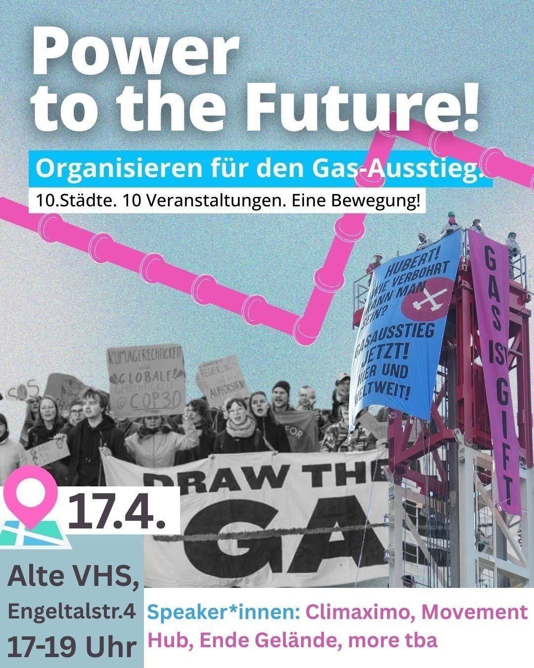 🔴 Während rechte Parteien immer weiter an Zuspruch gewinnen und das Leben für viele Leute immer teurer wird, will die Bundesregierung unter der Leitung von Bundeslobbyministerin Katharina Reiche 20 neue Gaskraftwerke bauen. ❌ Das betrifft uns alle: Sei es, weil wir hohe Lebenshaltungskosten zahlen müssen, die Gasförderung Lebensgrundlagen hier und besonders im globalen Süden zerstört oder wir nach jahrelangem Kampf für Klimagerechtigkeit nicht hinnehmen können, dass unsere Erfolge aus den letzten Jahren zunichte gemacht werden. Der Fokus der Veranstaltung wird auf antikolonialen Kämpfen gegen Gasförderung und -ausbau liegen. ⚡ Die Power to the Future – Speakerstour bringt deswegen in 10 Städten Aktivistinnen, Expertinnen und alle Leute die merken: „hier läuft was falsch“ zusammen, um uns von bisherigen Kämpfen inspirieren zu lassen und anschließend zu diskutieren, wie wir gemeinsam den Gasausstieg durchsetzen. 🍛 Im Anschluss gibt's lecker Küfa- Essen und weitere Möglichkeiten für Vernetzung und Austausch. Wir freuen uns auf euch!🔥